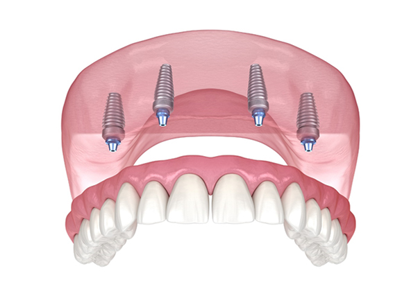 Fehlende Zähne in einer Kieferhälfte – mit einer festen Brücke, die auf Implantaten angebracht ist, lässt sich eine herausnehmbare Prothese umgehen.