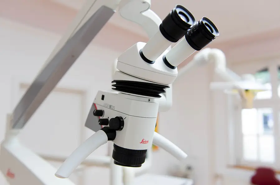 Bei der Wurzelkanalbehandlung ist ein besonders präzises Vorgehen erforderlich, da die Wurzelkanäle haarfein, häufig stark gekrümmt und vielfach verzweigt sind. Um alle Bakterien vollständig aus diesen Strukturen zu entfernen, arbeiten wir mit einem hochauflösenden Operationsmikroskop. Es vergrößert den Behandlungsbereich um ein Vielfaches und ermöglicht eine exakte Sicht auf selbst kleinste Details im Zahninneren.
